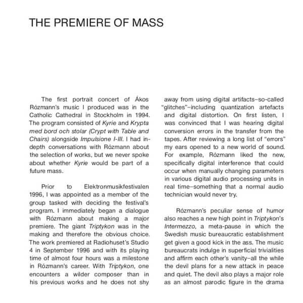 AKOS ROZMANN の1989年から2004年の間に制作された12のエレクトロ・アコースティック『Mass / Mässa』。